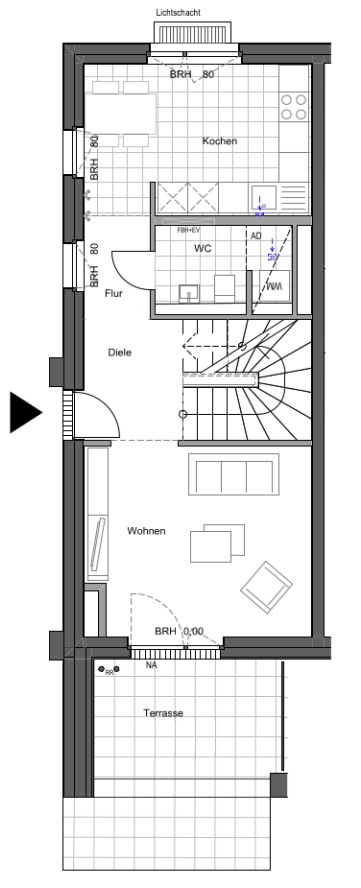 Im unteren Bereich liegt der Wohnraum - ein Ort für gemeinsame Abende, ruhige Stunden und alles dazwischen. Große Fenster sorgen für eine helle Atmosphäre. Von hier aus gelangen Sie direkt auf die Terrasse - ideal für den ersten Kaffee am Morgen oder entspannte Abende im Freien. Die separate Küche bietet Raum zum Kochen und Zusammensitzen. Ein Gäste-WC ergänzt diese Ebene praktisch.