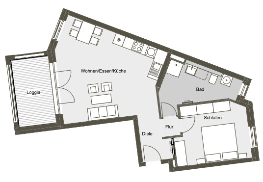 Die Loggia wird dabei zu einem festen Bestandteil des Wohngefühls. Durch die Lage im oberen Geschoss entsteht ein weiter Blick, der Ruhe schafft und den Raum nach außen ergänzt.
